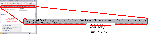 インターネットエクスプローラーの場合情報バーの警告が出ます。 |