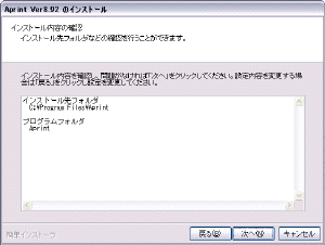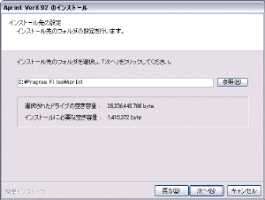 インストール先を設定します。 そのまま、Program Filesの中のAprintフォルダでいいでしょう。 「次へ」。 |