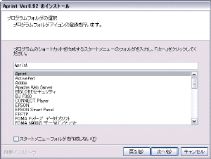 スタートメニューに追加する設定をします。 スタートボタン→(すべての)プログラム で開いたメニューの中に「Aprint」フォルダができるようになっています。 スタートメニューに作成しない設定もできますが、作成したほうがいいでしょう。 そのまま「次へ」。 |