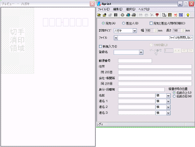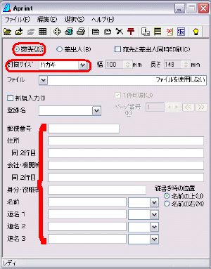 | 宛先にチェックがはいっています。 封筒サイズを選びましょう。はがきもあります。 登録名は飛ばして、郵便番号、住所、名前を入力しましょう。 左側のプレビューに入力した文字がレイアウトされます。 よければ印刷しましょう。 ファイル→印刷、または、印刷ボタン