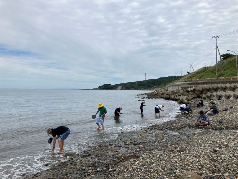2日目はいよいよ舎利石が採れるとされる浜辺へ。陸奥湾の灰色の海からゴーン、ゴーンと波が押し寄せる中、たらいに砂利をすくい取り、指ではじきながらそれらしい石を探します。おっ! あった? 早速、半透明の小さな石粒を発見。先輩に確認すると「いいね。いいけど、米粒みたいな形のものがいいので、そういうのを見つけて」と言われ、引き続き探索にかかります。これかな? 違うかな? 何回かチャレンジしていくと、だんだん見つける速度がアップしていきます。